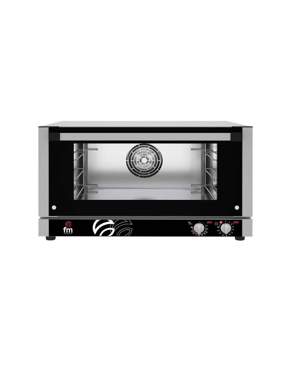 Horno profesional FM RX 603 para panadería, 3900W y 250ºC, 230V monofásico Schuko, capacidad 3 bandejas 600x400/GN1/1, con humidificador (ref. 710528), temporizador 0–60 min, modo continuo, lámpara interior, micro de puerta, inversor de giro y alarma fin de ciclo.