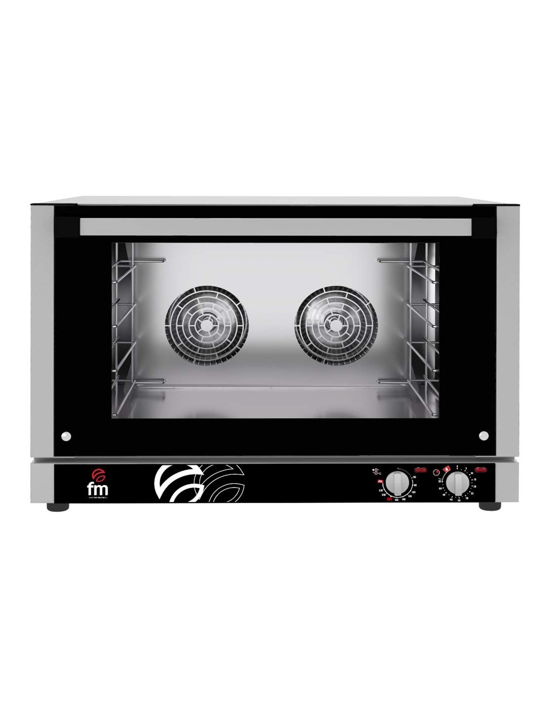 Horno profesional FM RX 604 Plus para panadería, 6300W y 250ºC, 400V trifásico 3F+N+T (cambio a monofásico opcional), capacidad 4 bandejas 600x400/GN1/1, con humidificador (ref. 710532), temporizador 0–60 min, modo continuo, lámpara interior, micro de puerta, inversor de giro, termostato de seguridad, alarma fin de ciclo y dotación 4 parrillas.